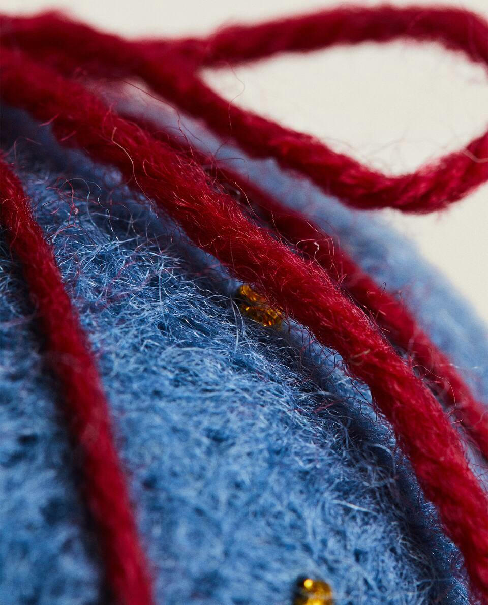 Christmas tree decoration, made of felt, in the shape of a bauble with sparkle detail and ribbon with bow at the top.